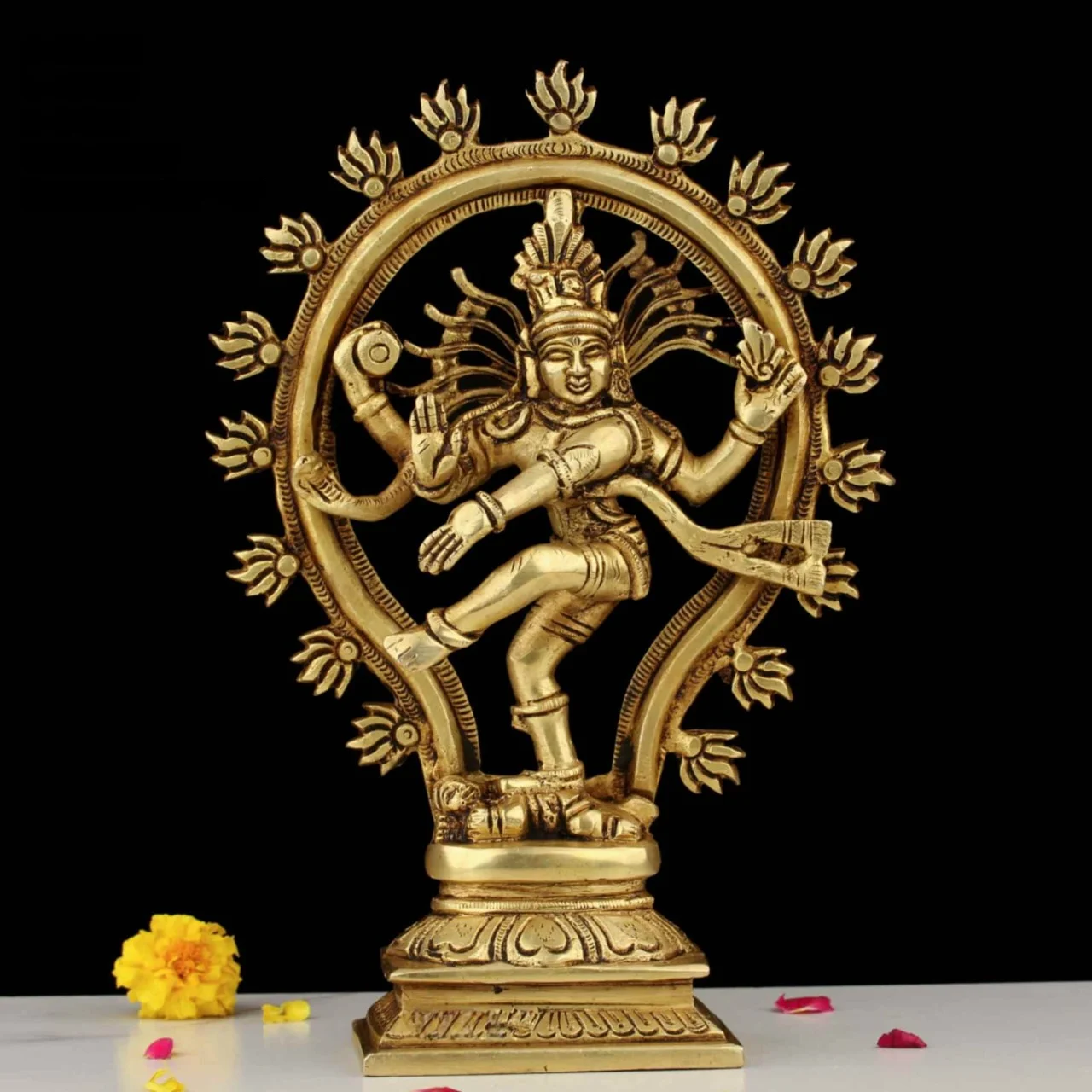 Design: Exquisitely handcrafted depiction of Lord Shiva as Nataraja, the cosmic dancer, surrounded by a circular aureole of flames (Prabhamandala). The sculpture highlights intricate details such as flowing hair, balanced posture on the demon of ignorance (Apasmara), and expressive facial features.