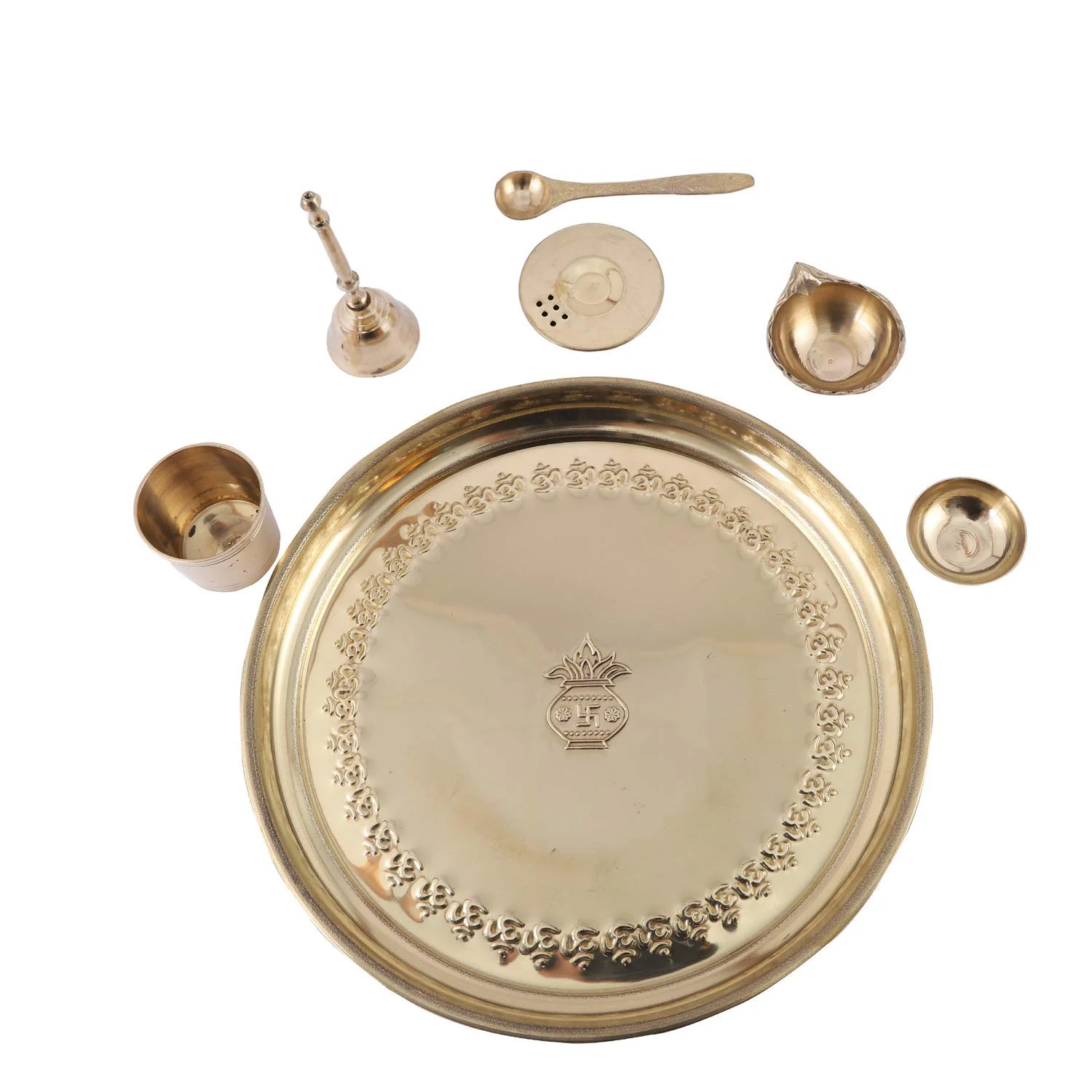 Traditional 10 Inch Pooja Thali Set with Ghanti, Diya, Roli/Kumkum Katori, Dhoop Agarbatti Holder, and Round Panchamrut Set