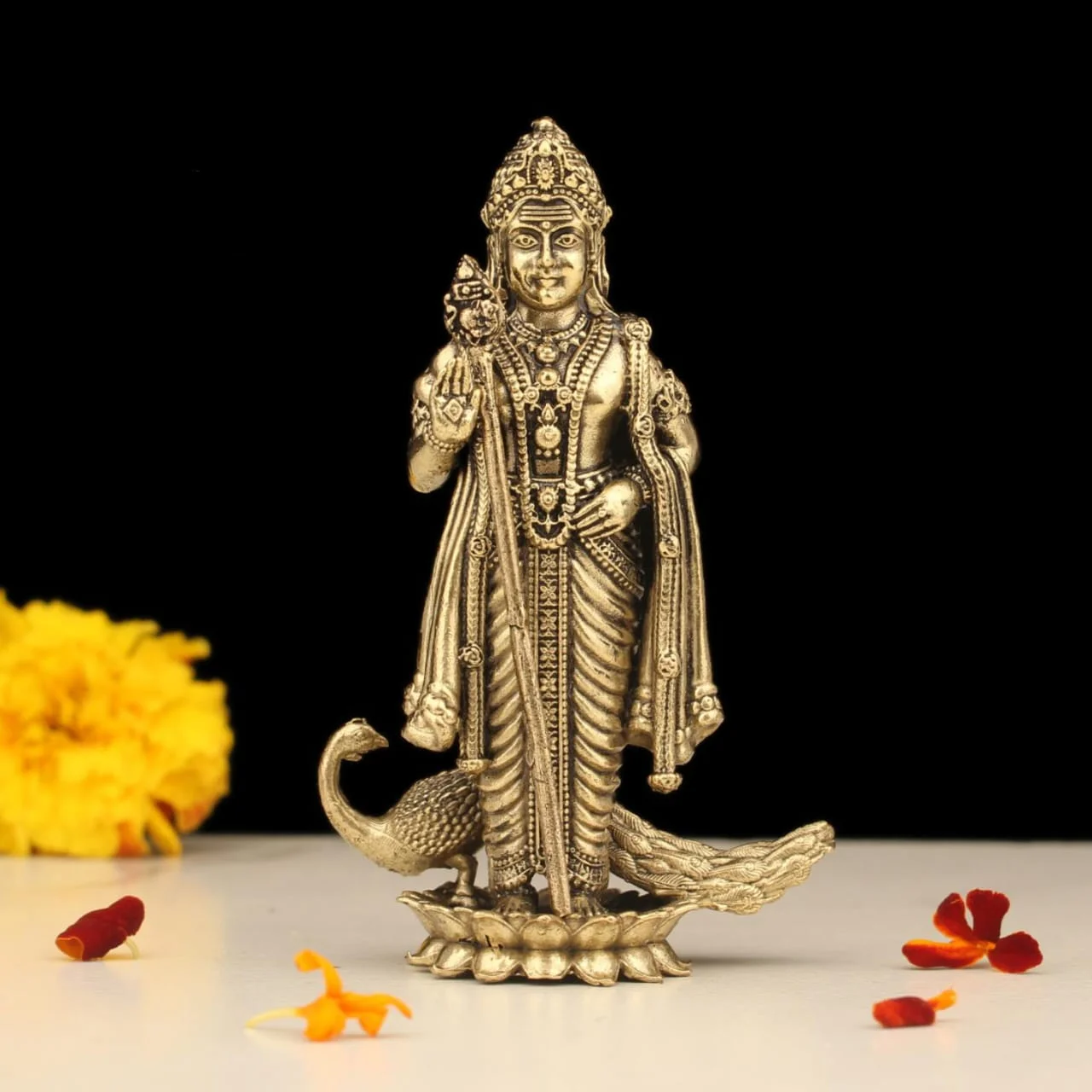 6-inch premium brass Murugan idol with peacock on lotus — perfect for pooja, home décor, and gifting.