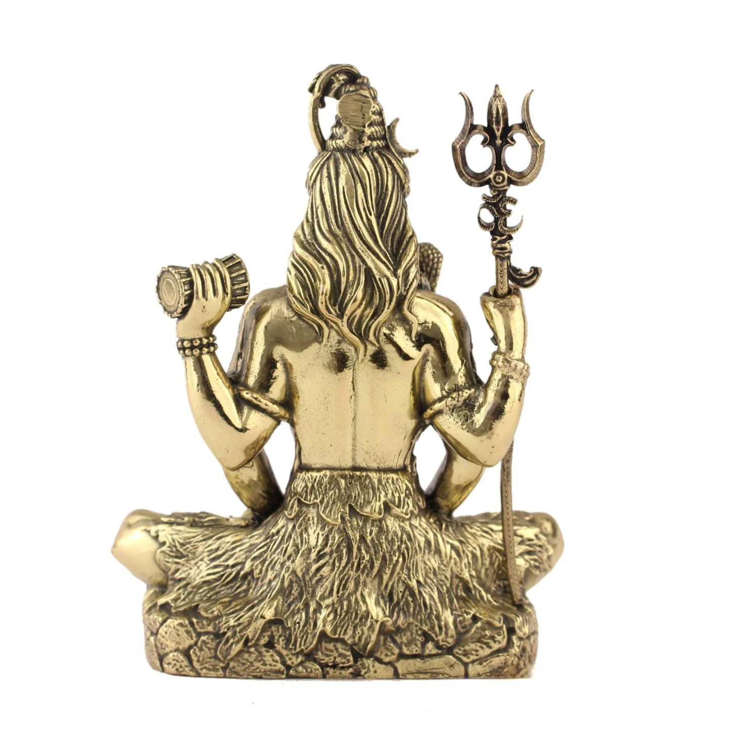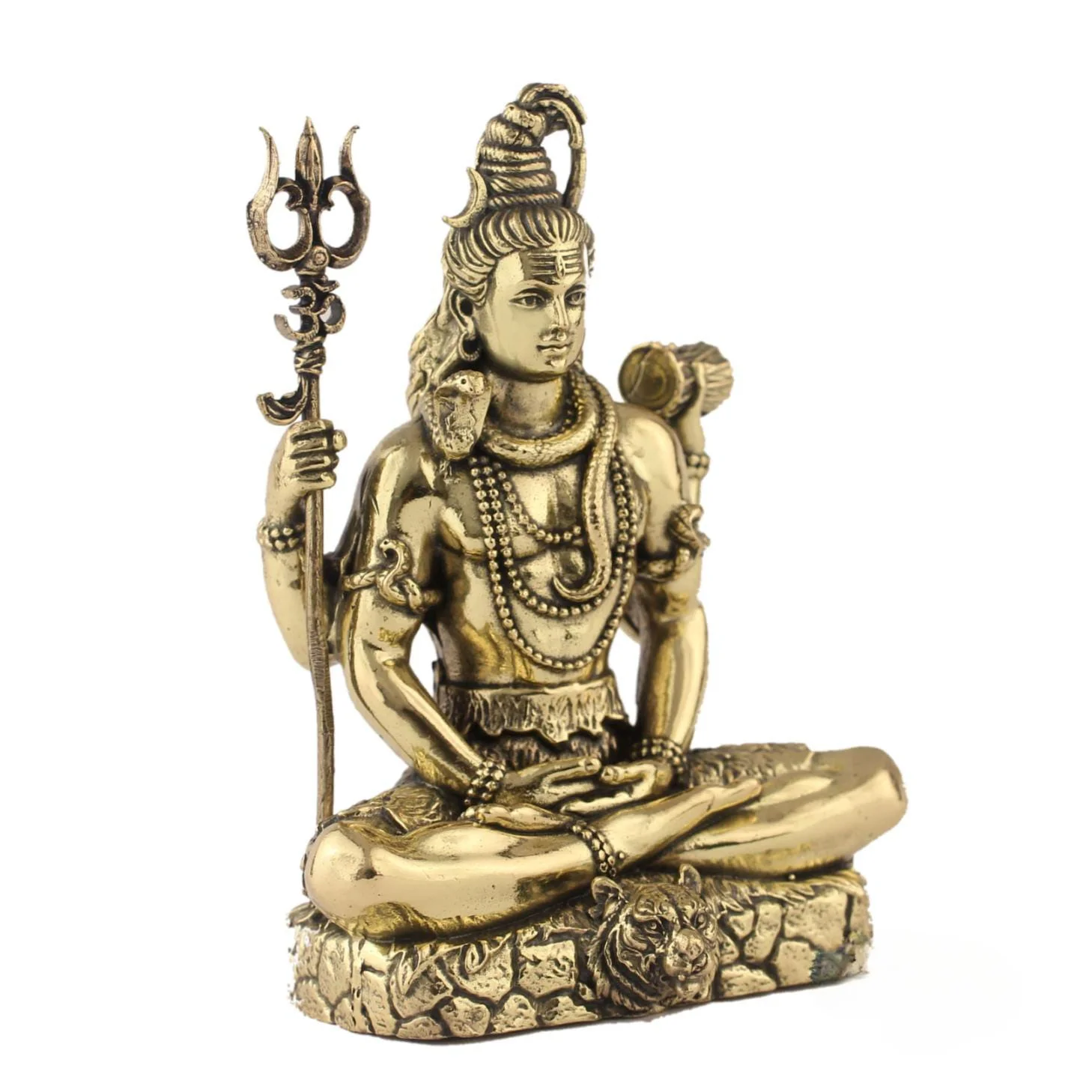 This stunning idol features Lord Shiva seated in a deep meditative pose (Dhyan Mudra), symbolizing peace, power, and transcendence. The intricate carvings include his matted hair, third eye, snake around his neck, and seated posture on a lotus base, all finished with a rich golden sheen.