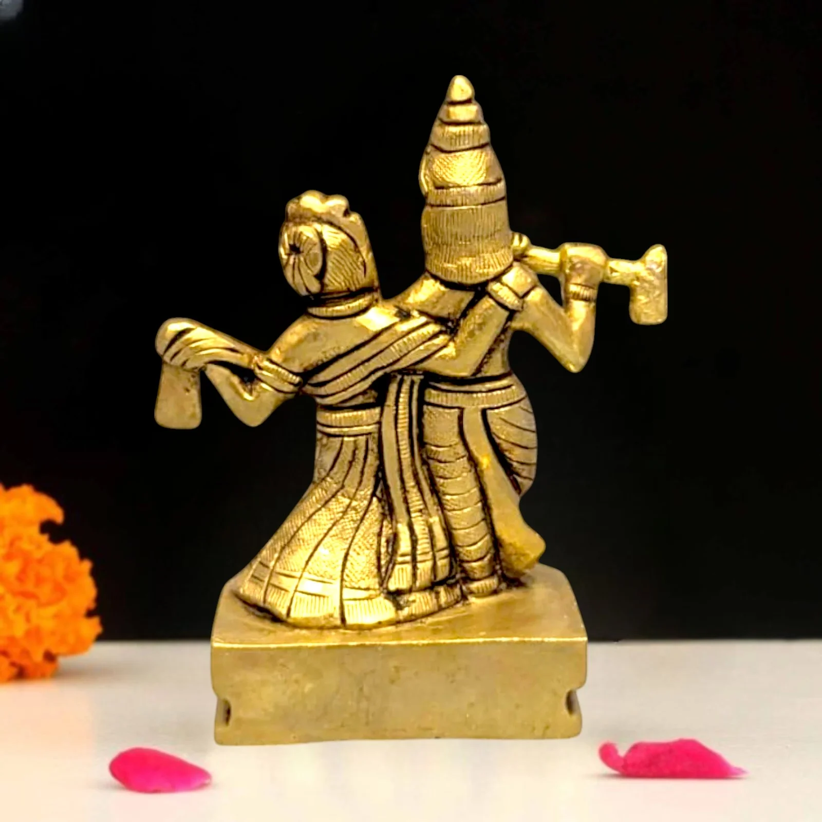 • Design: Intricately handcrafted Radha Krishna in traditional standing pose with rich detailing, antique brass finish, and sculpted base.