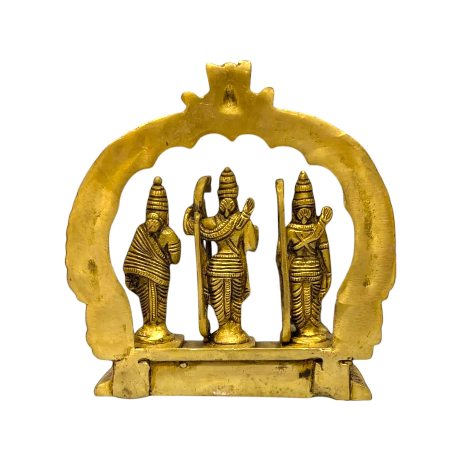 This divine Ram Darbar idol features Lord Rama holding a bow, accompanied by Goddess Sita and brother Laxman in a classic standing pose. The intricate detailing, embossed textures, and antique brass finish make it a perfect temple-style showpiece.