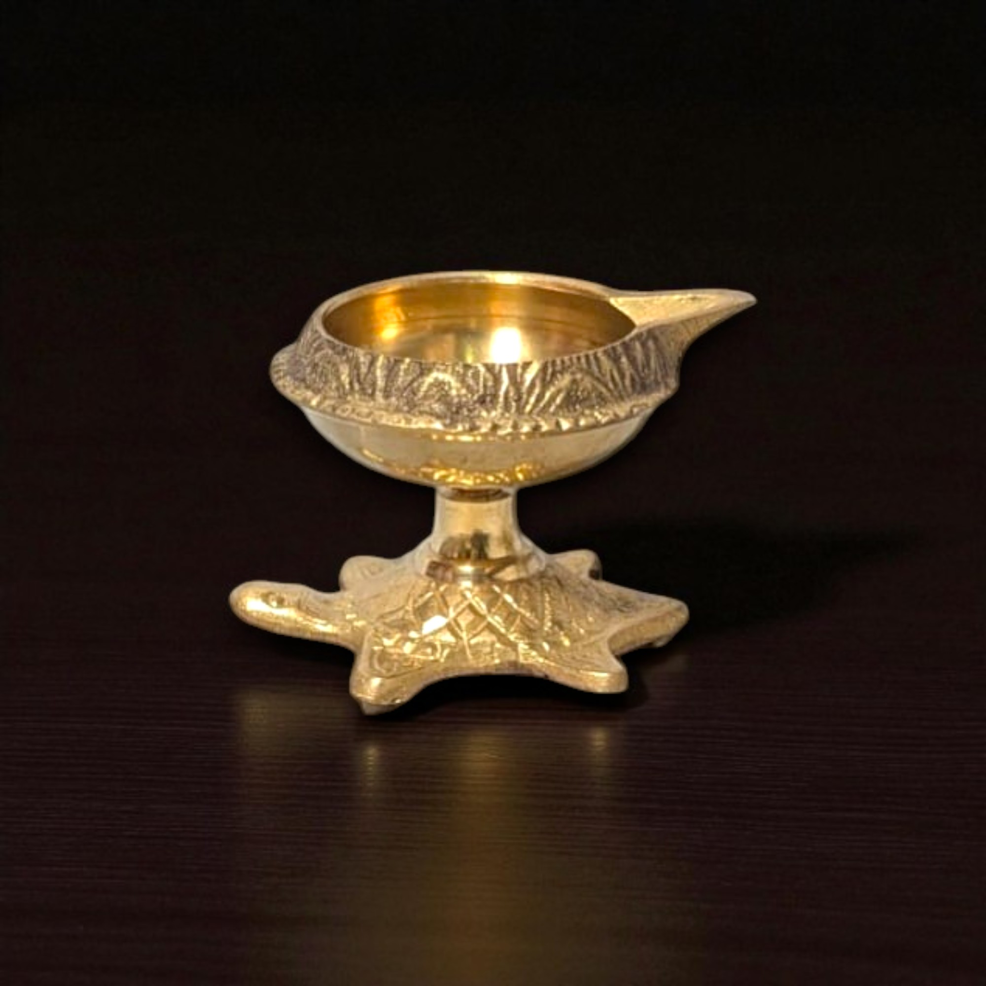 Intricately designed turtle-shaped base with a diya (deepam) on top. The turtle symbolizes longevity, stability, and positive energy in Vastu and Feng Shui. The diya bowl is shaped for easy oil filling and wick placement, making it both functional and decorative.