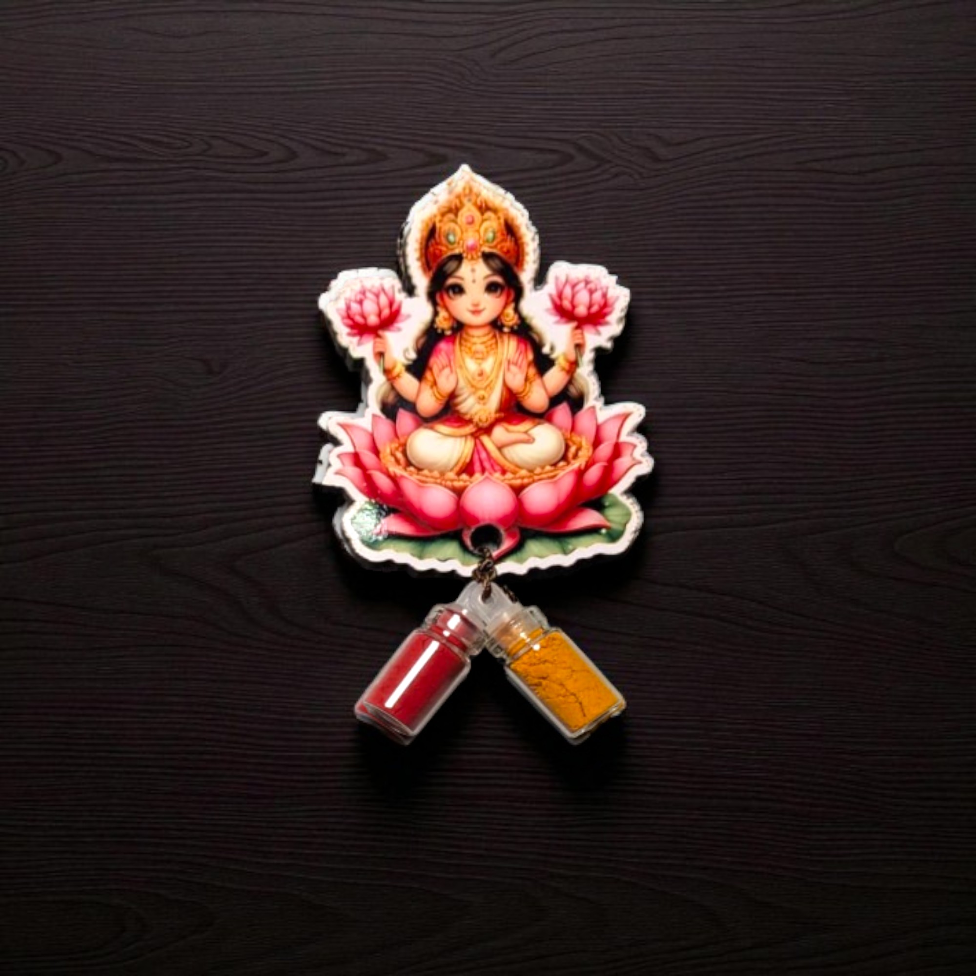 Vibrant and meaningful design featuring a beautifully crafted fridge magnet attached with two miniature bottles filled with sacred haldi and kumkum. Embellished with traditional motifs, spiritual symbols, or divine figures (like Lakshmi, Ganesha, or Kalash), creating a blend of utility and devotion.