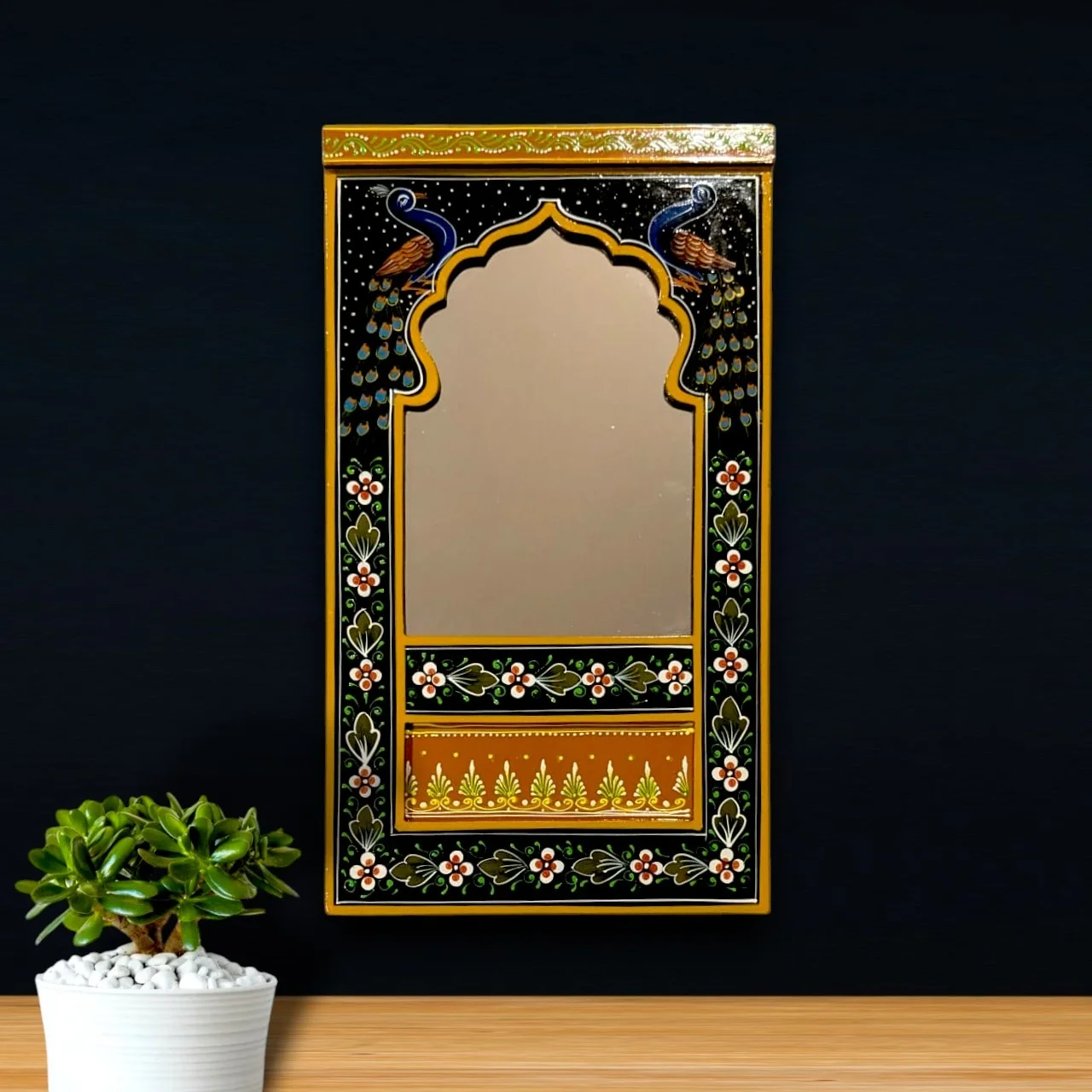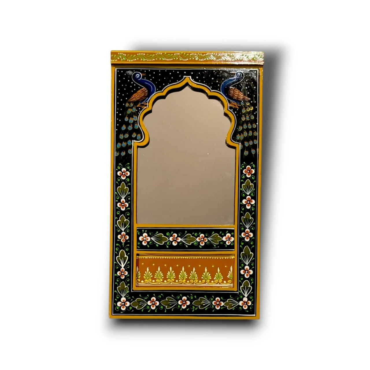 A stunning Mehrab-style wooden mirror frame inspired by Mughal and Rajasthani architecture. The frame features intricate hand-painted floral motifs in vibrant traditional colors, giving it a rustic vintage charm that adds depth and elegance to any wall.
