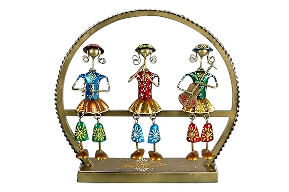 This decorative showpiece features a traditional Rajasthani tribal musician sitting on a jhula (swing), beautifully handcrafted and hand-painted with vibrant colors and intricate detailing. The fusion of cultural art with metallic sculpture adds charm to modern and ethnic interiors alike.
