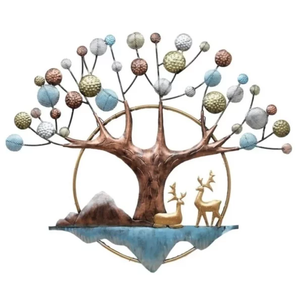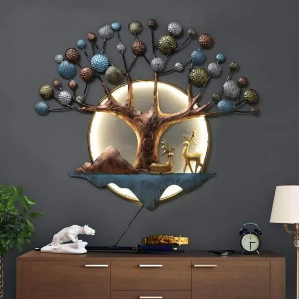 A serene and artistic representation of two deer standing under a tree with a glowing full moon, crafted in metal and highlighted with warm LED lights. The vibrant Holi-themed multicolour detailing enhances the festive vibe and adds warmth and elegance to any interior.