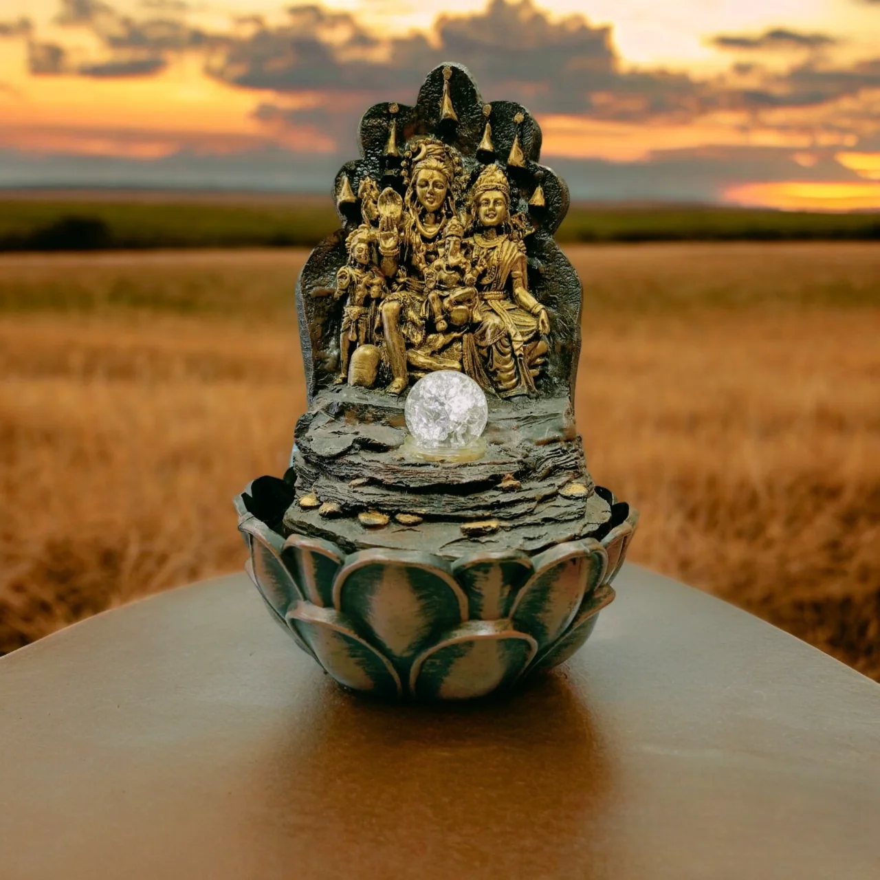 Intricately crafted design featuring Lord Shiva, Goddess Parvati, and Lord Ganesha seated together in a serene composition. Water trickles gently from the top, enhanced by a crystal ball and LED lighting, symbolizing peace and divine flow.