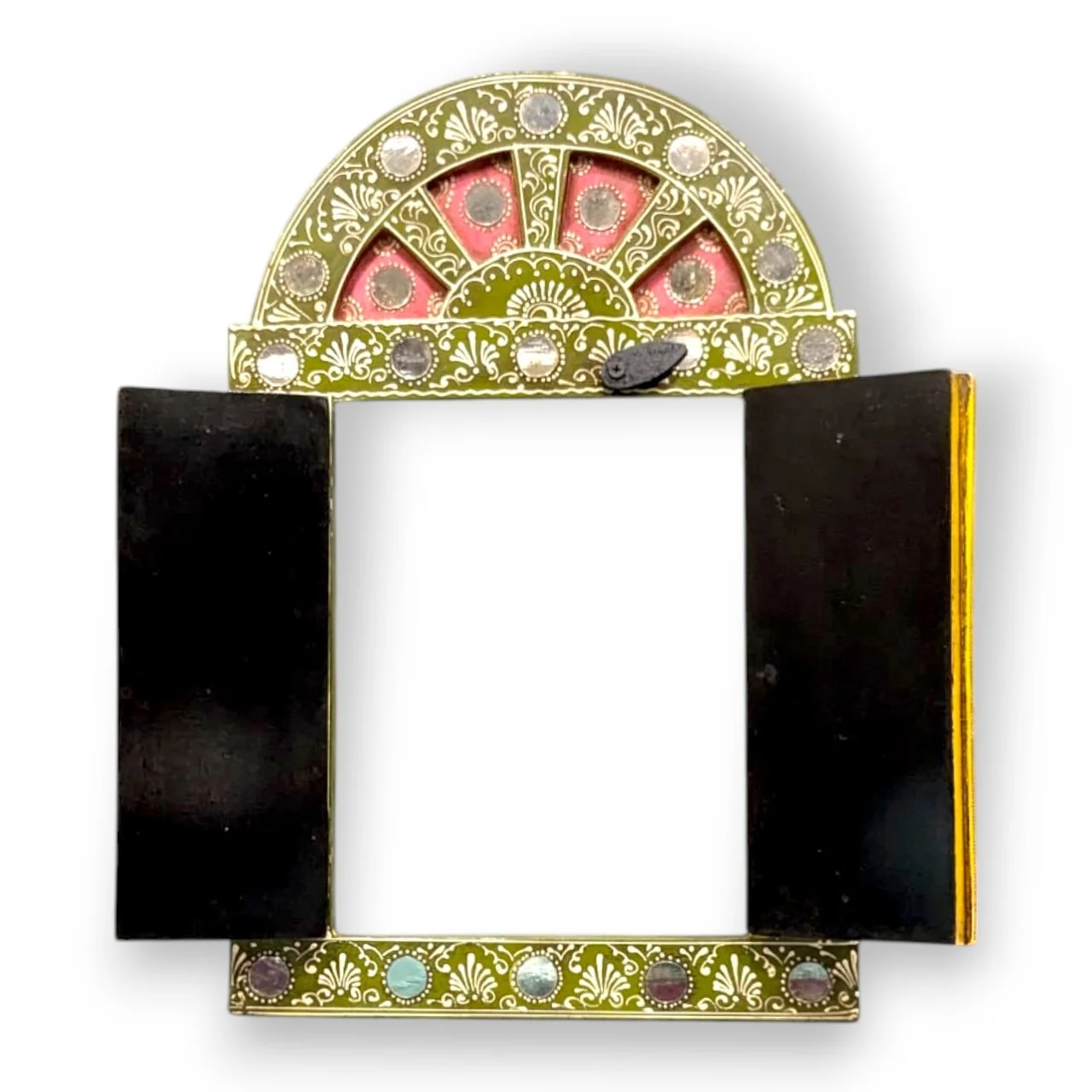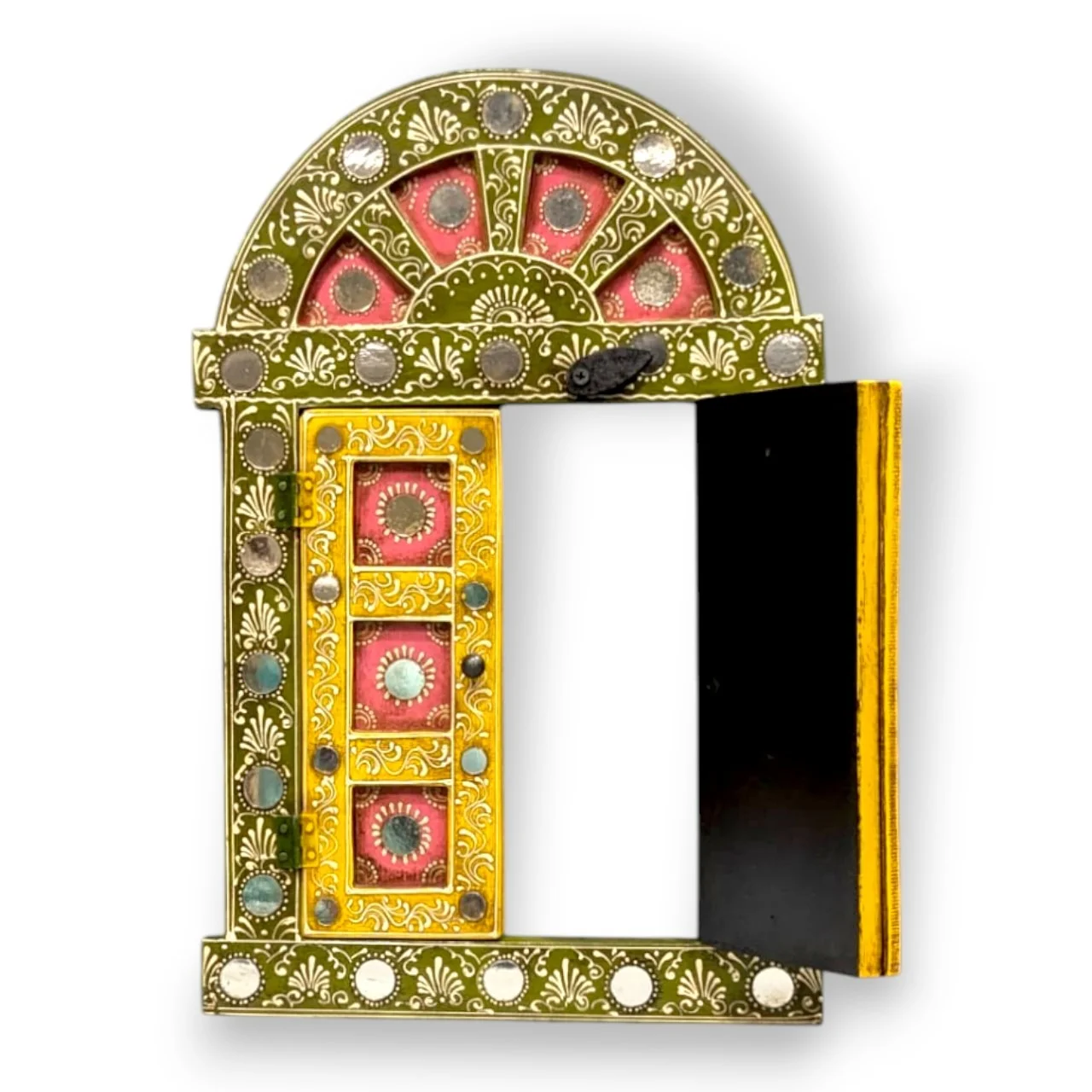 Inspired by traditional Indian architecture, this ethnic carved wooden window (Khidki) wall hanging features intricate hand carving, aged textures, and glass mirror work. The vibrant multicolour paint brings out a rich, antique look, perfect for vintage-inspired interiors.